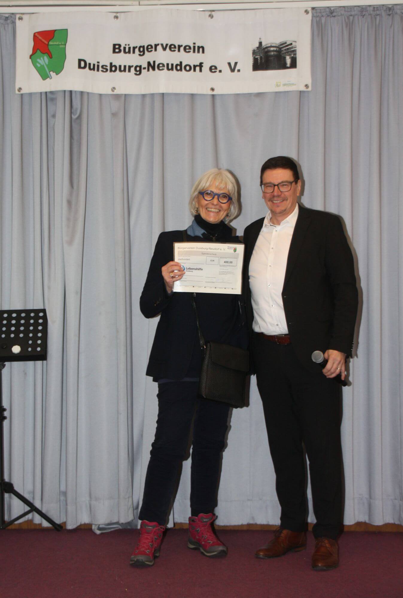 Auf dem Neujahrsempfang des Bürgervereins Duisburg-Neudorf e.V. im Januar konnte Dagmar Frochte, stellvertretend als Vorstandsvorsitzende des Lebenshilfe Duisburg e.V., wieder eine großzügige Spende entgegennehmen: 400 Euro spendete der Bürgerverein für unsere beliebte Karnevalssitzung. Dagmar Frochte bedankte sich ganz herzlich bei Heike Ketter und Detlef Wacker für die erneute Unterstützung. Die Karnevalssitzung der Lebenshilfe Duisburg war in diesem Jahr wieder eine rundum gelungene Veranstaltung mit vielen freudestrahlenden Gesichtern aller Jecken mit und ohne Handicap, die nur durch Spenden ermöglicht werden kann.